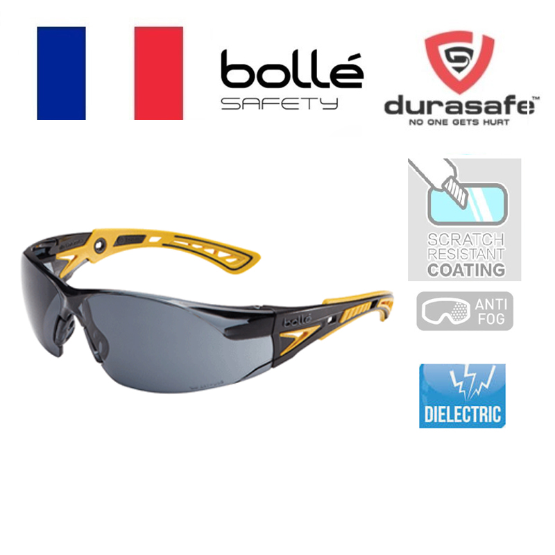 Rush+ safety glasses feature an ultra-sporty design, with co-injected, highly flexible bi-colored temples. Also features upper protection with a non-slip bridge. Lenses are anti-fog and anti-scratch coated on both sides and platinum coated.