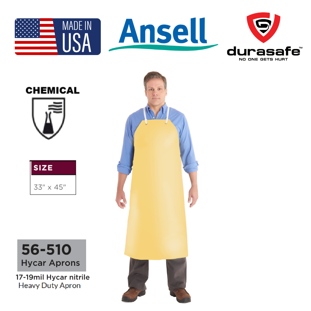 Cold-resistant heavy-duty Hycar nitrile apron, for chemical splash protection with puncture and abrasion resistance.