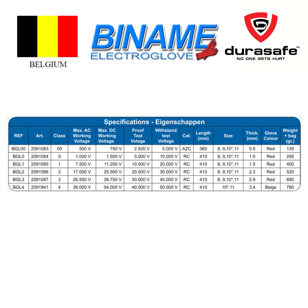 They are rated as a “Class 00” 2,500 Volts and “Class 0” 5,000 Volts glove with a maximum actual use voltage of 500 Volts and 1,000 Volts in accordance with EN 60903.