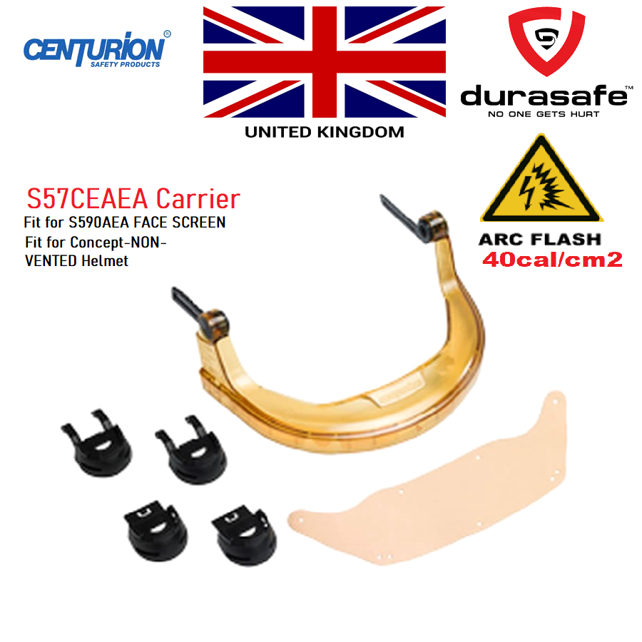 Facial screen carrier Arc Pro for helmets, in polyetherimide, to use in combination with the visors 225mm and 170mm for arc flash risks posed by electrical faults. Complete with Euro clips (S565) and Connect clips (S570) with Vabon sweatband. This system is fully tested to protect up to 40cal/cm2.