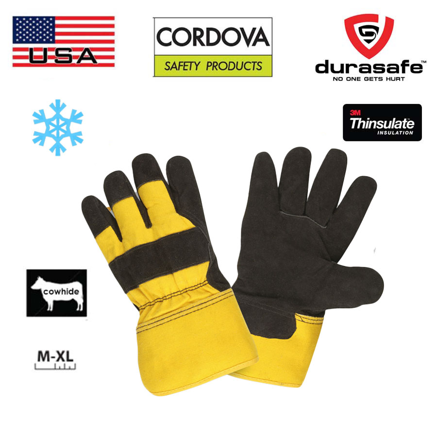 This cowhide, split leather palm is insulated for warmth with pile lining, a synthetic wool. It features a rubberized safety cuff for added protection and gunn cut pattern.