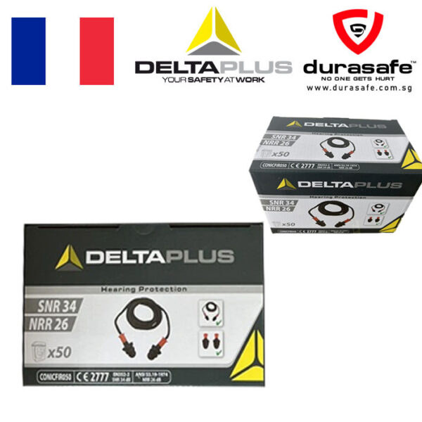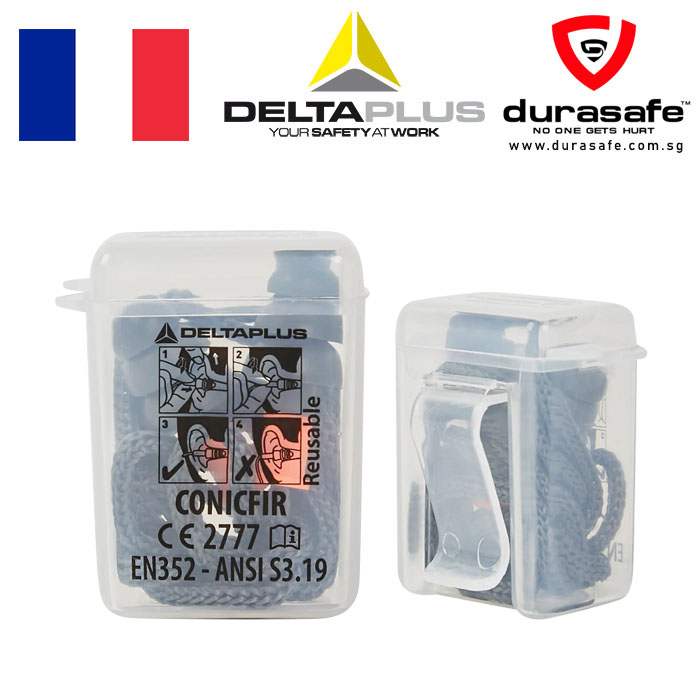Box of 50 pairs of reusable TPR earplugs with fabric cord. Can be used with or without cord.