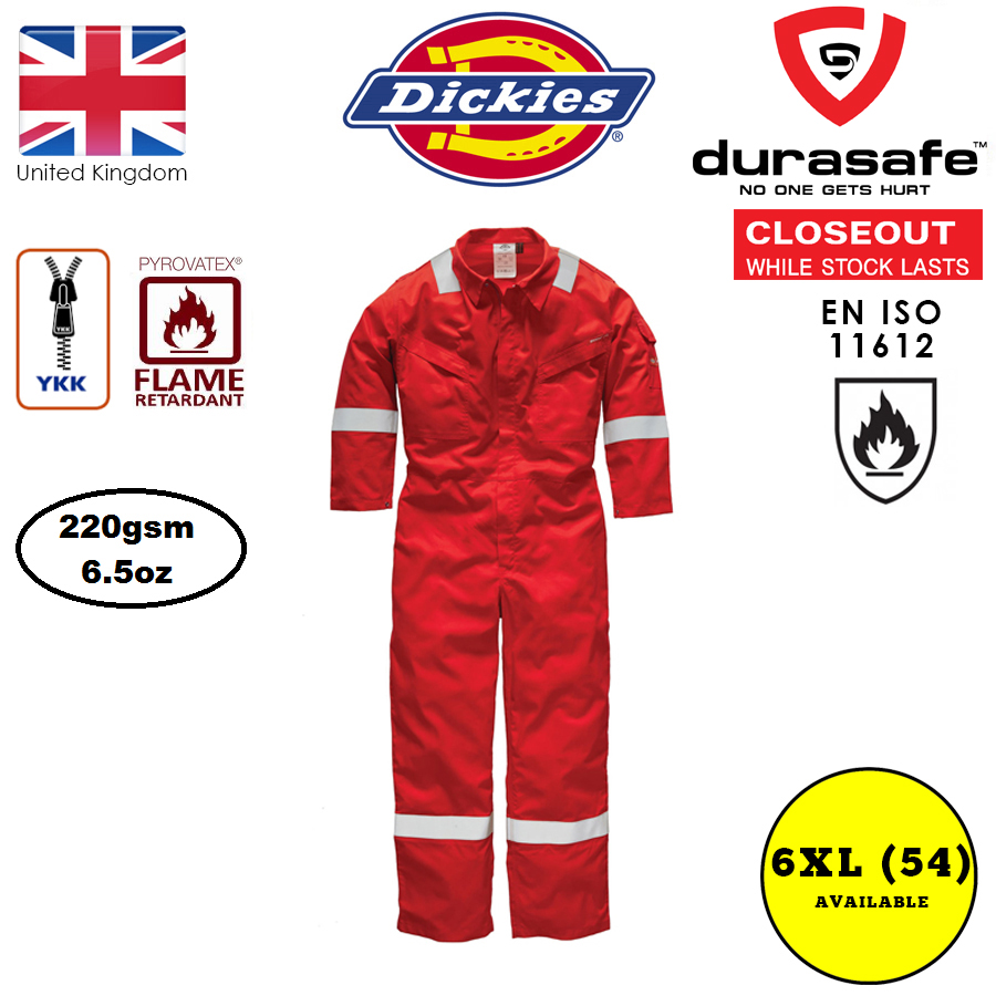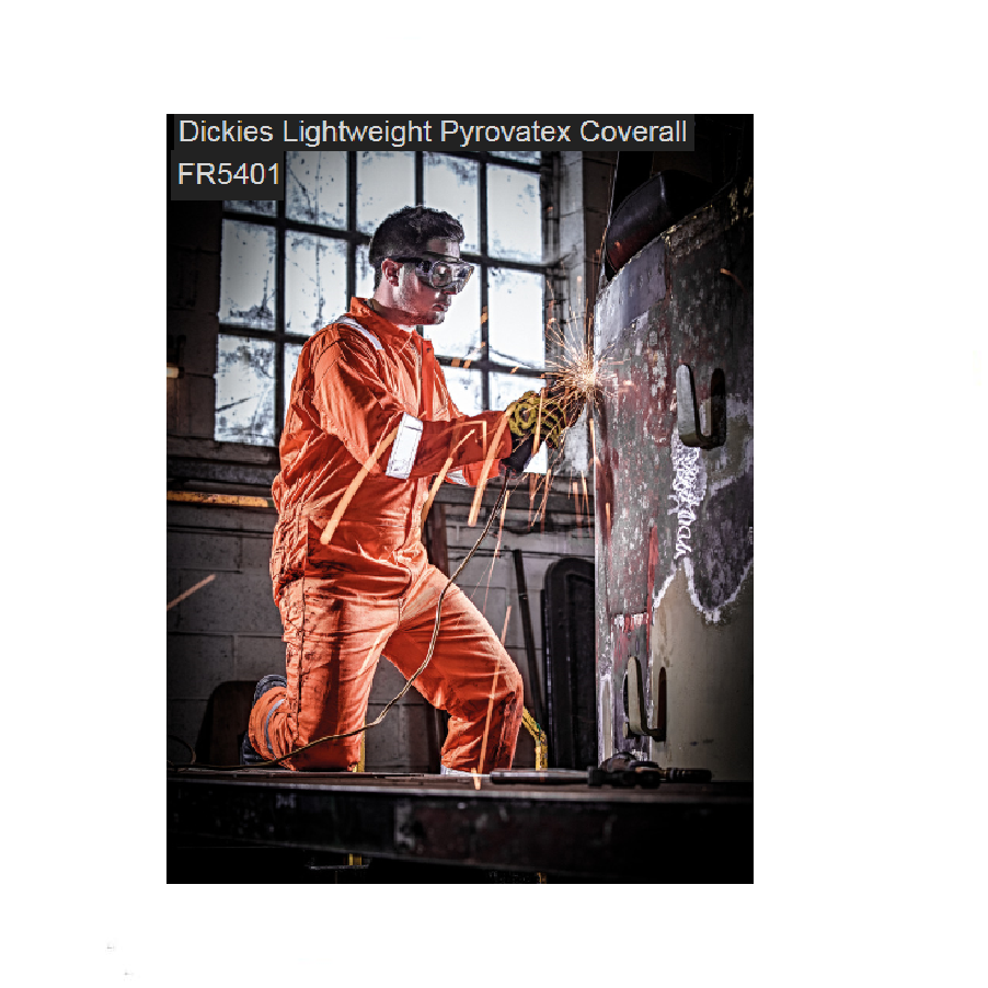 These lightweight flame retardant overalls have replaced the FR5055, which used to be the best selling Dickies FR Overall. This updated design offers maximum protection against heat and flame with it’s cotton being Pyrovatex® FR treated. Additionally the garment features flame retardant reflective tape across the shoulders, arms & legs and an extended collar area for throat/neck protection. There are side access pockets, which will allow entry to garments worn beneath this coverall and additionally there are two back pockets and a rule pocket.