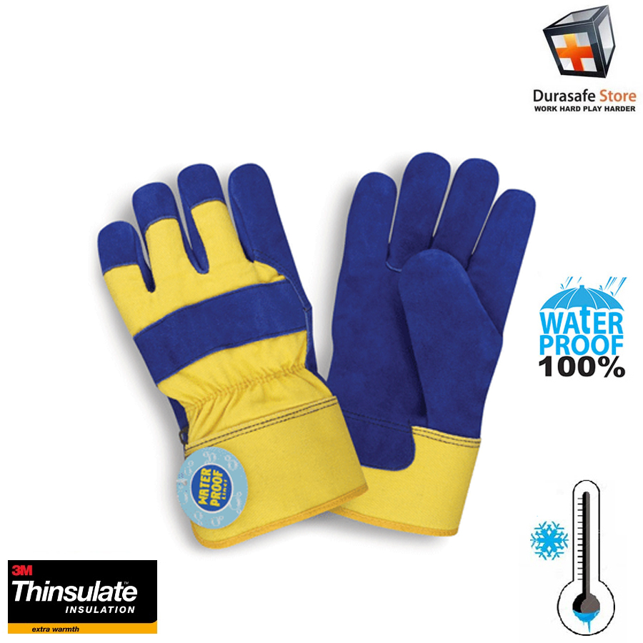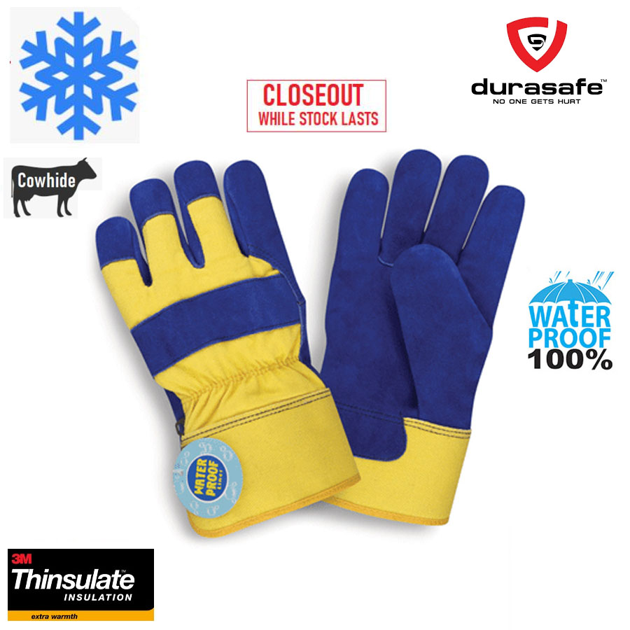These Thinsulate®-lined split cowhide leather gloves will keep your hands warm and dry, even in blizzard-like conditions. The waterproof lining and safety cuffs combine to keep ice and snow away from your hands. Gloves feature a full leather index finger, knuckle strap and leather fingertips. To ensure worker comfort, the gloves are designed in a wing thumb, gunn cut pattern.