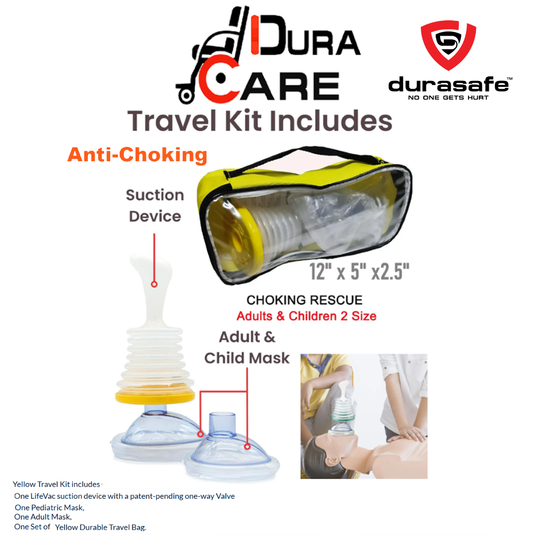 Protect your family and friends with this choking rescue device! Choking is the 4th leading cause of accidental death and the leading cause of death for children under the age of 14 and adults over the age of 65. Take this product with you on the road and leave another at home (when you purchase two). The rescue choking device includes one LifeVac suction device with a patent-pending one-way Valve, one pediatric mask for children, one adult mask, and one set of instructions for using the LifeVac, all included in a durable yellow travel bag.