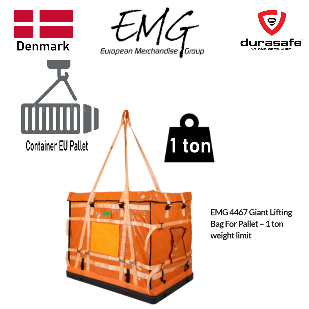 EMG 4467 is a very large heavy-duty lifting bag designed for pallet lifting in the offshore windmill industry, built to fit a full EU-pallet and reduce the number of lifts. Made from durable tarpaulin with hard plastic walls, stainless steel buckles, and 4 reinforced lifting straps, it safely carries up to 1 ton.