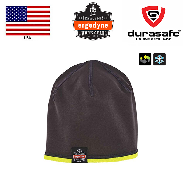 Reversible Knit Cap: Snug-fitting reversible knit cap featuring a stretchable gray and a soft hi-vis lime side for work and play.