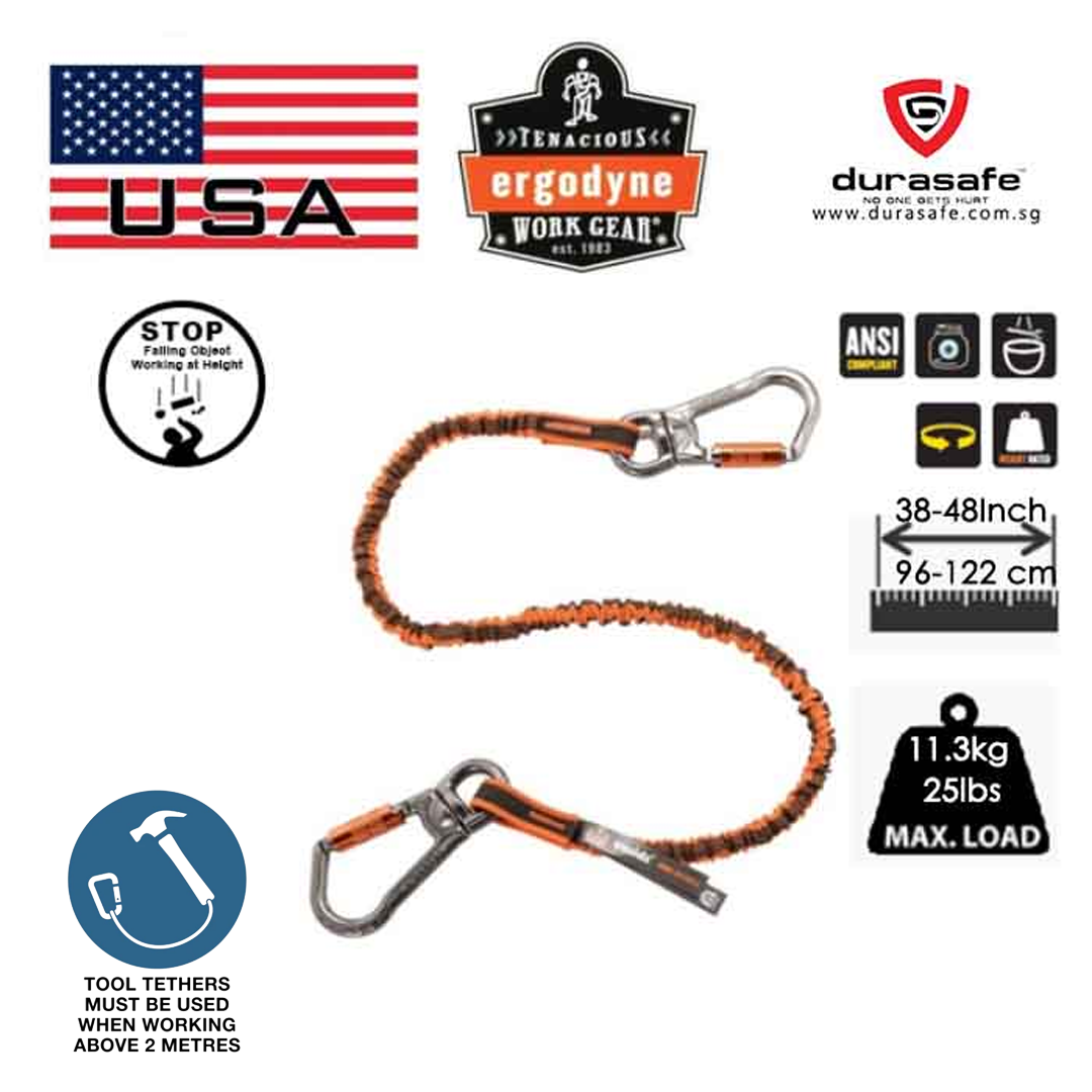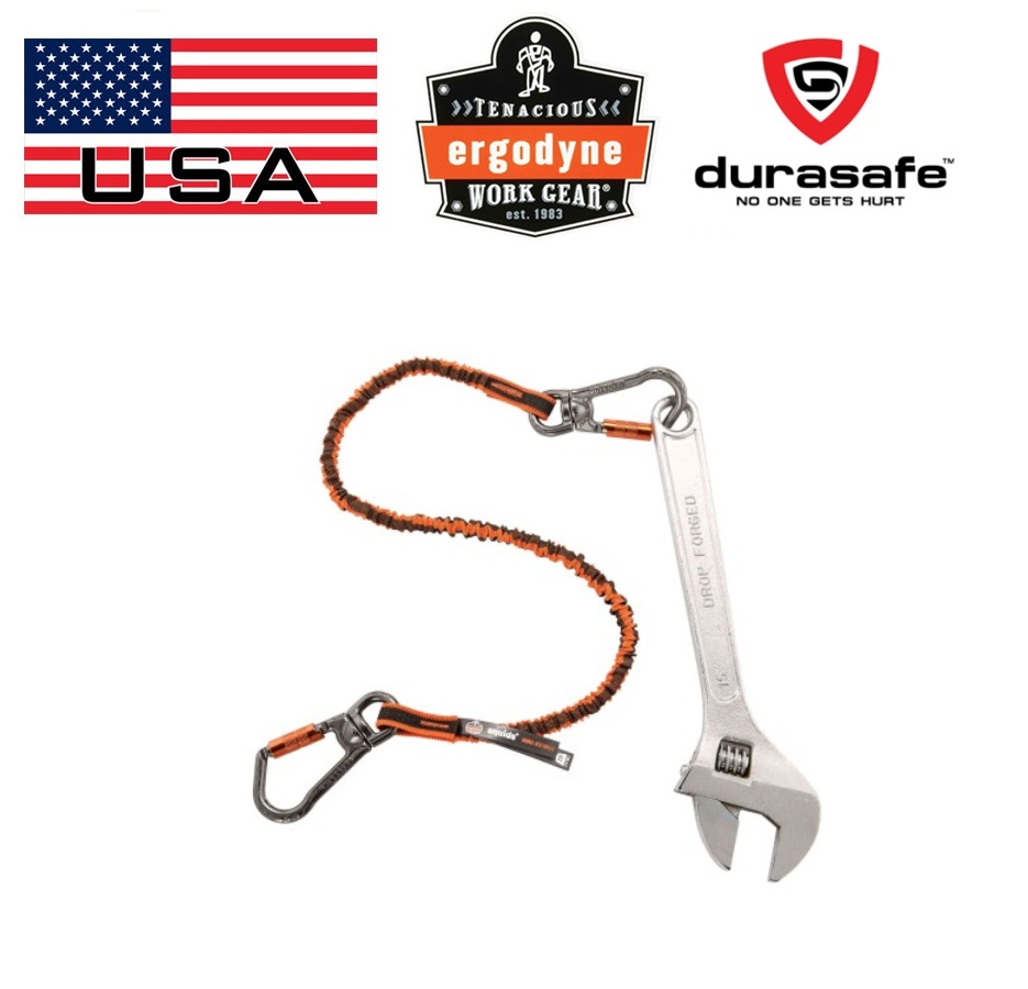 Shock absorbing tool lanyard with swiveling, locking carabiners on both ends: Designed and tested to prevent falling objects and reduce the force the anchor point sees if a drop occurs by absorbing the energy transmitted through the tool lanyard. Swiveling design helps prevent tangles and binding.