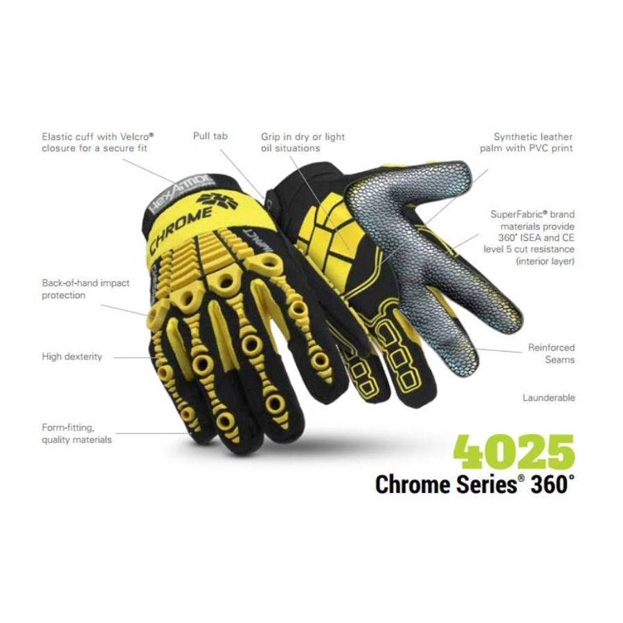 Hexarmor 4026 Chrome Series Impact, Cut & Puncture Resistant Mechanics Glove Yellow, Size M-XL Over 25 times the cut resistance of the mechanics? gloves you?re wearing right now, and over 10 times the cut resistance of Kevlar?! It?s time to ditch the flashy, non-protective mechanics? gloves, and upgrade to the Chrome Series?.