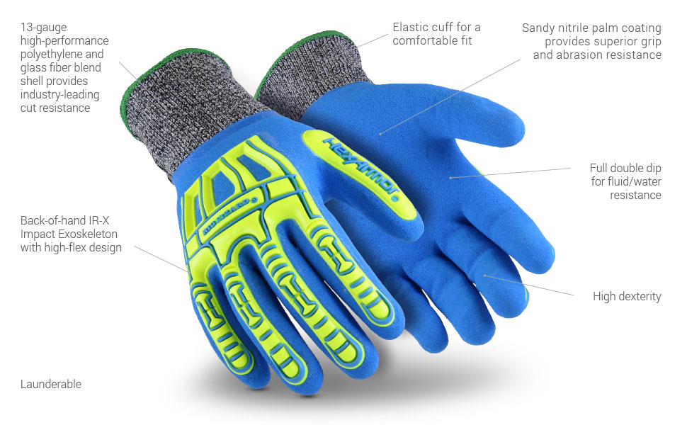 The new Rig Lizard® Fluid 7102 delivers high-performance protection. With a full double-dip for fluid and water resistance over an HPPE and fiberglass shell, this Rig Lizard® Series glove is equipped for some of the toughest jobs on site. In addition to a sandy nitrile palm dip for superior grip and abrasion resistance, the 7102 also features our highly flexible IR-X® Impact Exoskeleton™, so workers hands are protected from smash and pinch injuries.