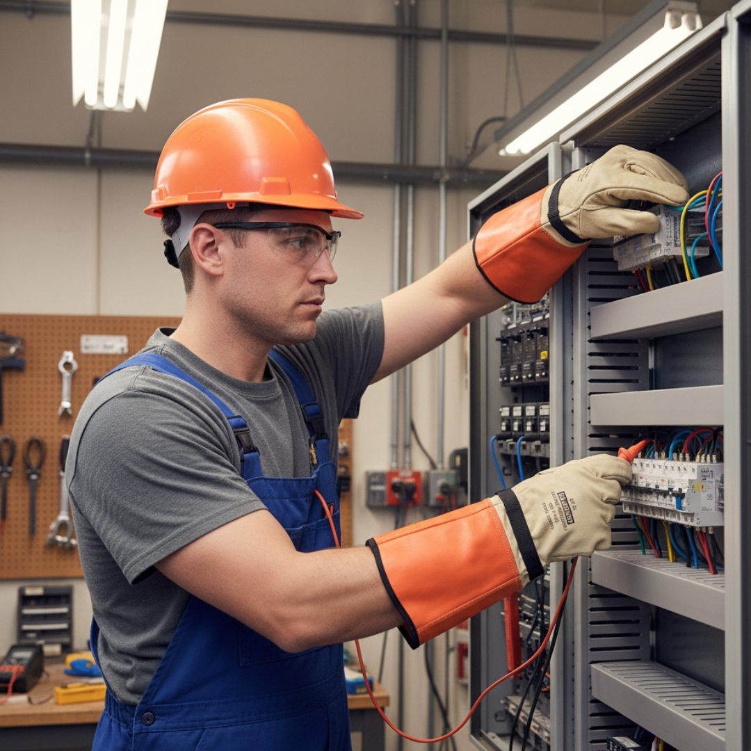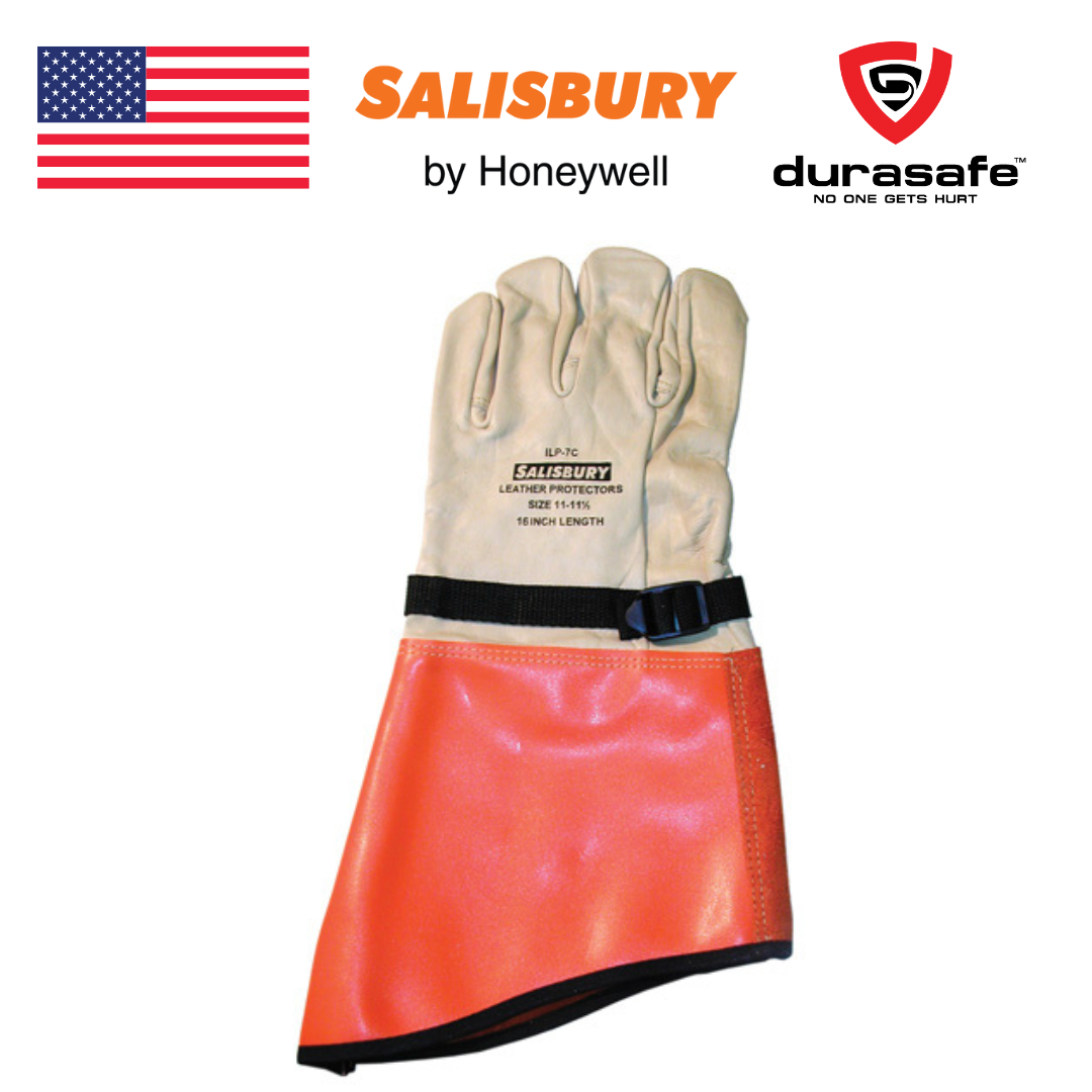Cuffs are tough leather on palm side and orange vinyl on the back of the hand.
