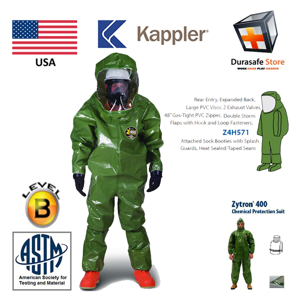 KAPPLER Zytron 400 Z4H571 Splash Total Encapsulating Level B Chemical Suit Green, Size S/M, L/XL, 2X/3X is one tough chemical suit, with excellent physical properties. It’s also a bargain by comparison, with a broad range of chemical protection typically found in garments costing much more.