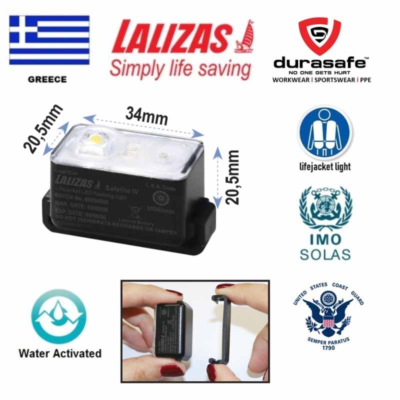 The LALIZAS Lifejacket flashing light “Safelite IV” is the ideal one for both offshore and oceangoing vessels able to enhance all crew’s safety. Its high battery performance and automatical activation when in contact with water add an extra safety feeling while sailing on board. It is manufactured under SOLAS guidelines. Detailed features of this product are: