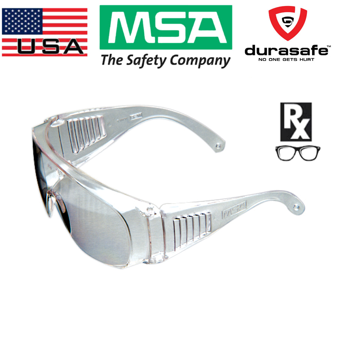 Fit over prescription glasses, most economical model, integrated side shields, clear or gray tinted, boxes of 10 in dispenser-style container