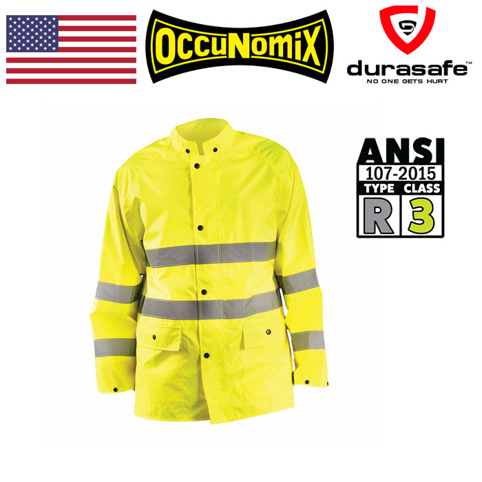 This Class 3 Rain Safety Jacket by OccuNomix offers a classic design that features ANSI 100% Polyester 150 Denier Oxford with PU coating for breathable, waterproof material with sealed seams. 2″ Silver reflective tape aligns the sleeves and mid section. This model also features a detachable snap hood along with wrist cuff with snaps, Front zipper closure with snap storm flap to keep the rain out. 2 deep lower pockets along with a front with flaps. This hi vis workwear meets ANSI/ISEA 107-2015 Type R, Class 3 Standards.