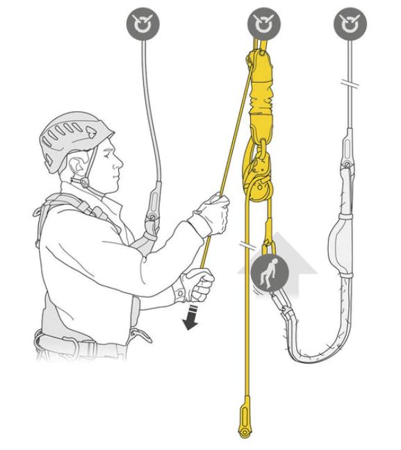 The JAG SYSTEM haul kit for pickoffs, making a releasable anchor, or tensioning a system, thanks to its 4:1 mechanical advantage and excellent efficiency (sheaves with sealed ball bearings). The collapsed kit is highly compact, allowing it to be used even when the distance to the anchor is very short. The JAG SYSTEM haul kit is quick and easy to deploy: it is ready to use thanks to the flexible cover that prevents any risk of tangling. The haul end is color-coded for instant identification. It is available in three lengths: 1, 2 and 5 meters.