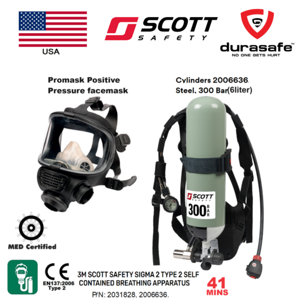 The SIGMA-2 Type 2 will accept all Scott B.A. cylinders Apparatus is CE Marked to EN137:2006 Type 2 and MED approved PROMASK FACEMASK Promask incorporates a wide panoramic visor to maximize the field of vision and a front mounted speech diaphragm for easy communication with colleagues. An optional hard coated visor is available to enhance resistance to scratching.