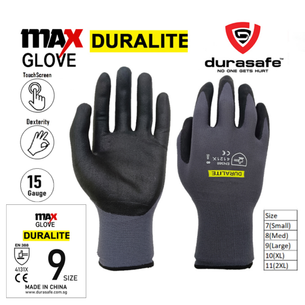 MAXGLOVE DURALITE 9″ Gray PU Nitrile Palm Coated Knitted Nylon Glove Size 7 – 11