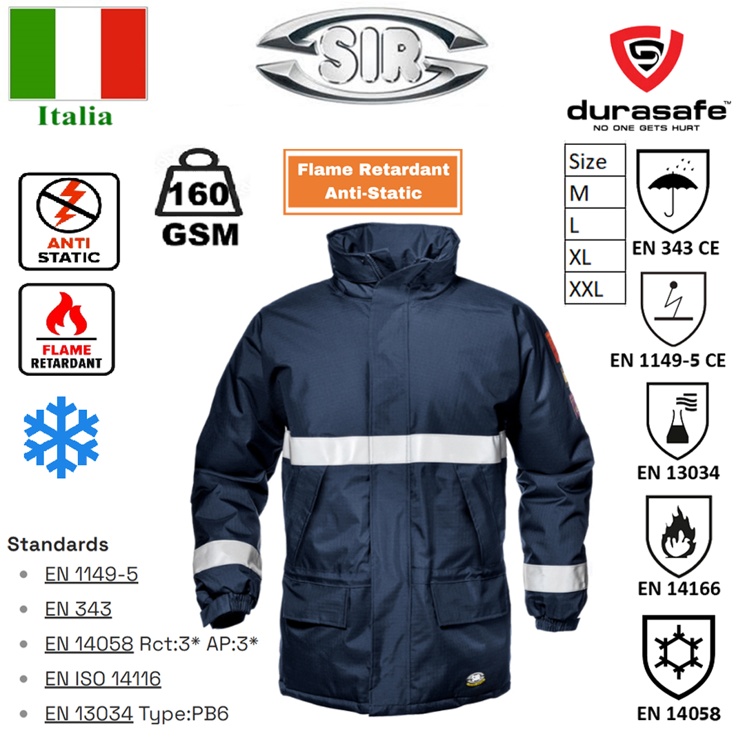 Breathable and waterproof jacket with cold resistant padding (200 g/m²), with antistatic, flame retardant and chemical resistant properties. Outer and cold resistant padding in 99% polyester, 1% conductive fibre fabric. With rollaway hood, two-way concealed zipper closure with flap and snap buttons, inner wallet pocket closed with Velcro, two outer muff pockets and two waterproof pockets with flap and Velcro, adjustable elastic cuffs with Velcro, drawstring waistband, reflective band around sleeves and chest.