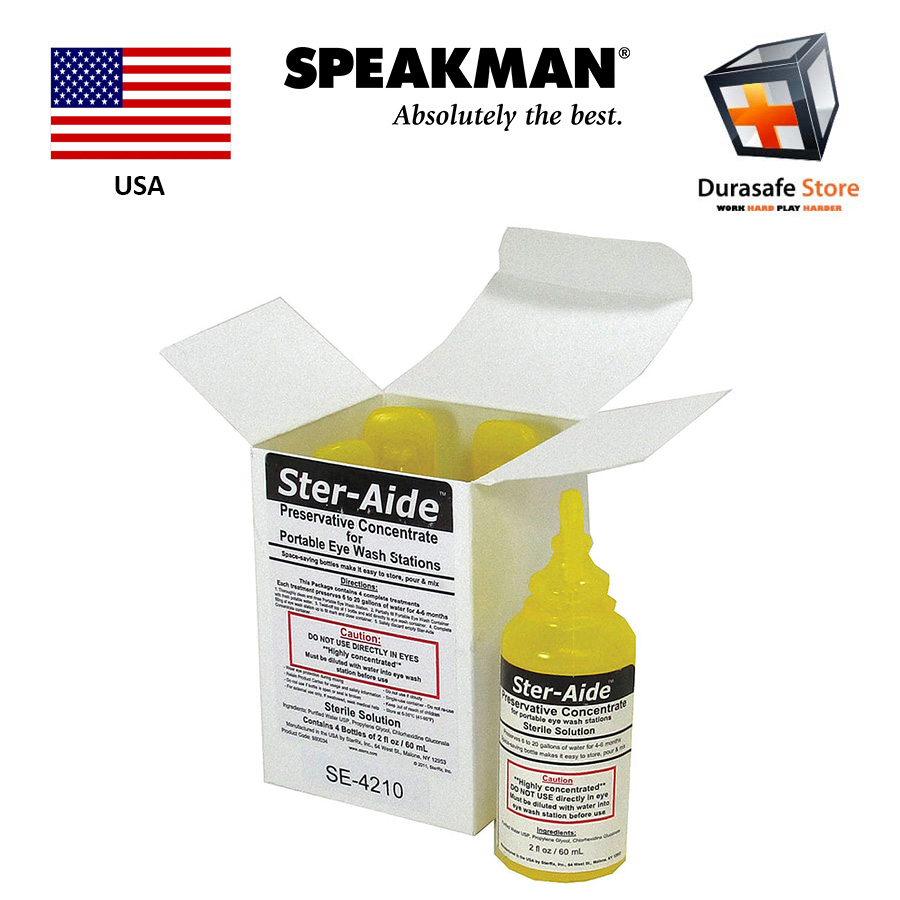 The SPEAKMAN – USA Emergency Eyewash SE-4210 Ster-Aide Preservative Concentrate x 4 is Ster-Aide preservative concentrate for portable eyewash stations. Once mixed each bottle of treatement preserves 6 to 20 gallons of water for 4-6 months. The SE-4210 is a case of 4 2 fl oz. bottles.