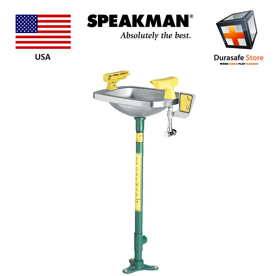 The Speakman SE-420 Emergency Pedestal-Mounted Eye/Face Wash (with Rectangular Stainless Steel Receptor) features a stay-open ball valve, in-line strainer, and galvanized steel pipe with a drain tee and floor flange. It is activated by a stainless steel push handle. The spray pattern is a 9” x 8” (72 sq. in.) curtain of aerated water, easily controlled at any pressure for maximum protection. It allows users to comfortably flush their eyes for the ANSI recommended 15 minutes.