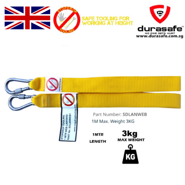 Stopdrop Tooling Yellow Web Tool Lanyard with locking screw gated carabiner for working at height. Labelled with maximum weight guidelines and part number