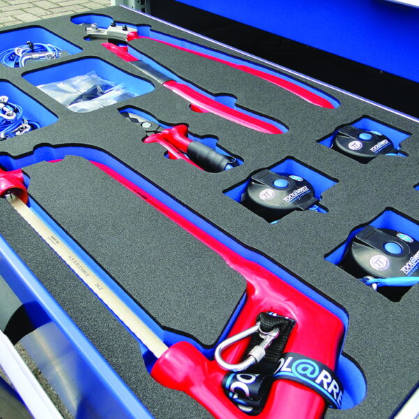 Secured in foam lined 6-drawer tool chest with forklift base for easy handling. Developed specifically for larger departments or fixed installations where greater tool choice trumps mobility.