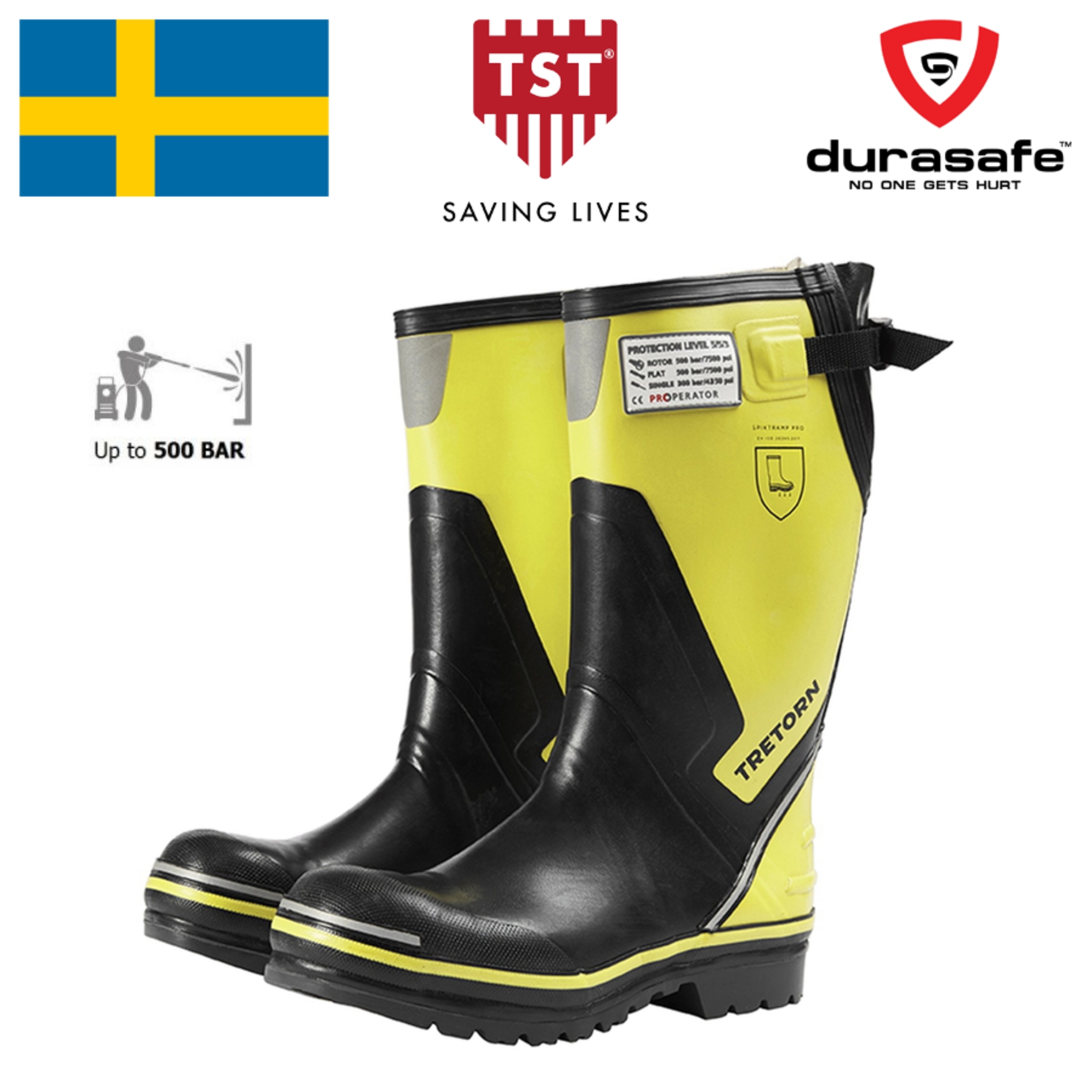 • Made entirely of vulcanized rubber, the black parts of the boots are reinforced and withstand high pressure water jets