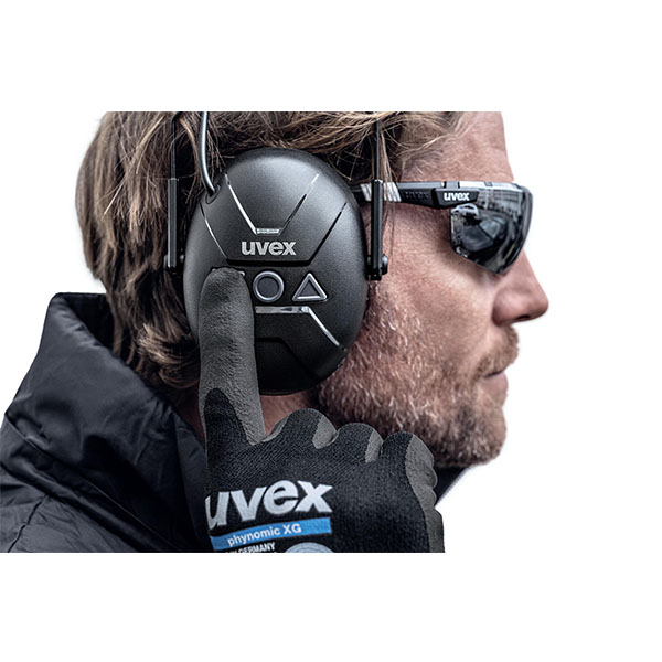 uvex aXess one are active Bluetooth earmuffs with RAL (real active listening) function. Users can still hear ambient noise despite wearing hearing protection, so they can still communicate with others and react effectively to warning signals. The volume of the ambient noise can be adjusted to suit individual needs, as the integrated sound level limiter protects the hearing from impulse sounds. The Bluetooth 5.0 connection can be used to connect to a telephone or radio, so users can communicate with others without interrupting work. The dual connection mode enables two devices to be connected at the same time. The functions can be operated quickly and easily using the function keys on the earmuffs — and both hands remain free for work. The audio assistant provides the latest status updates, so there is no need to remove the earmuffs in hazardous areas. When not in use, uvex aXess one can be stored easily without taking up much space thanks to the foldable headband. Another storage option is our earmuff bag with belt loops, article no. 2000002